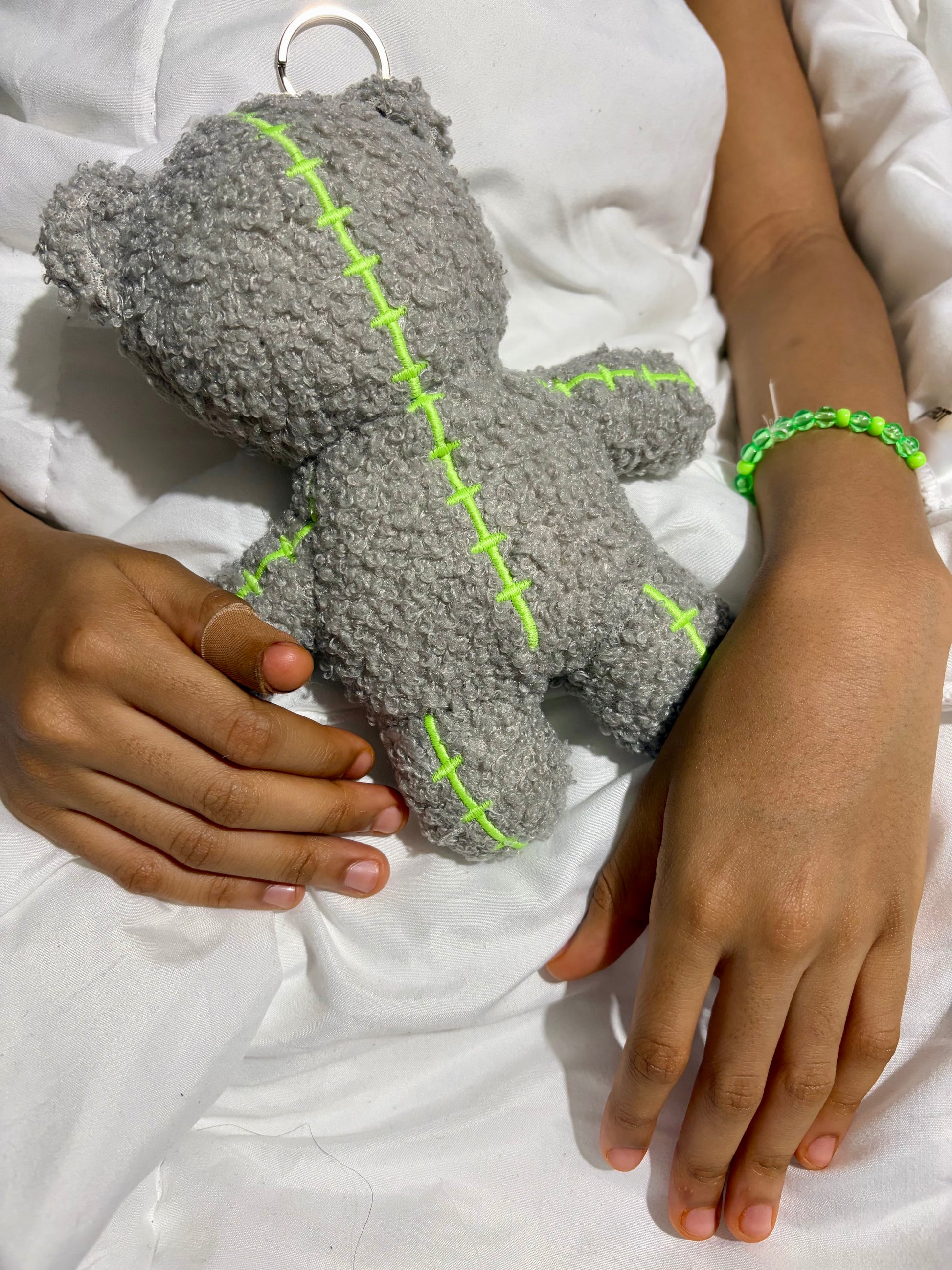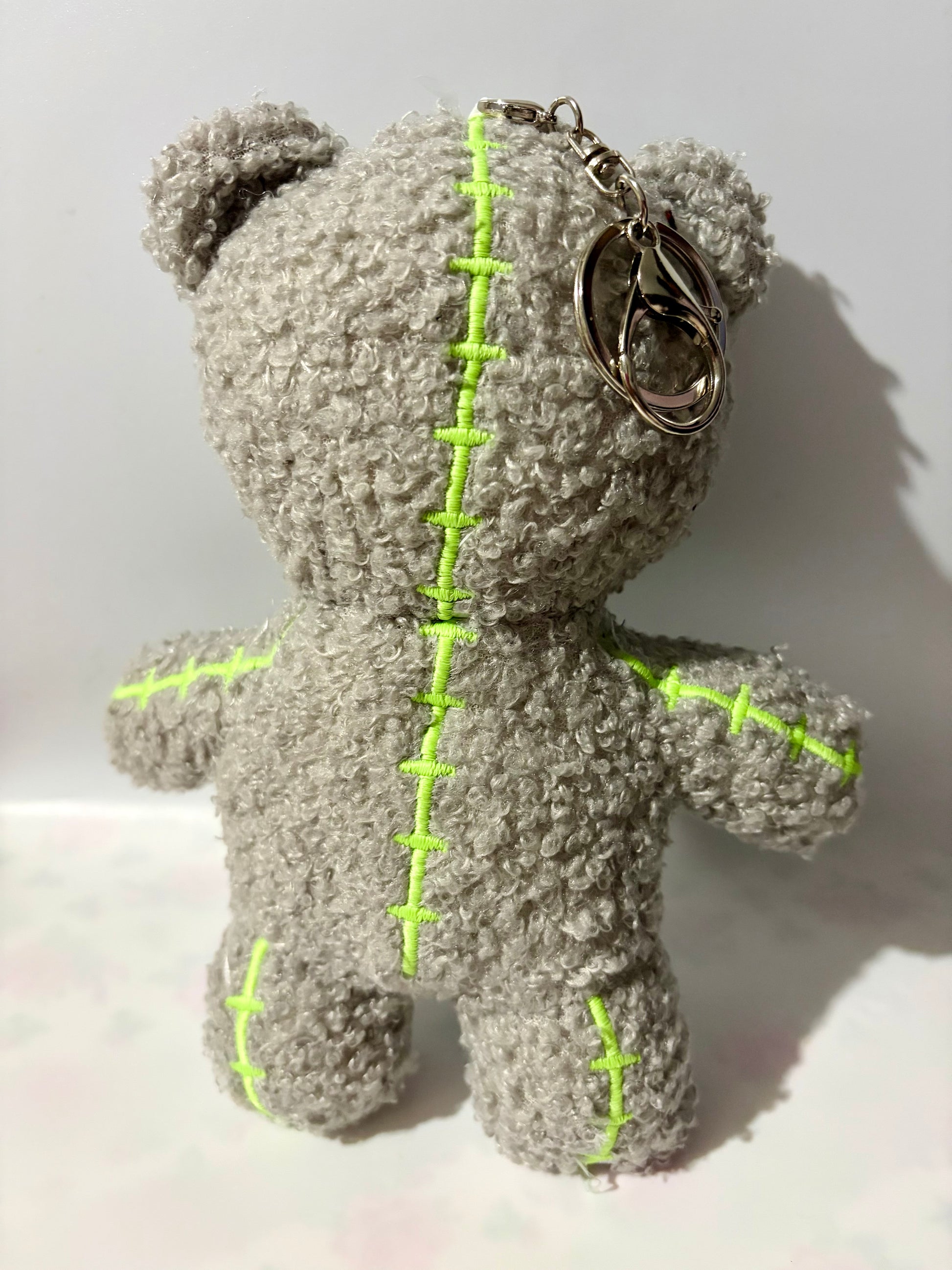 A soft plush bear keychain featuring Faceless Love’s signature neon energy stitching. The neutral grey tone pairs with anything while symbolizing quiet strength and emotional resilience. Clip it onto your keys, purse, or backpack as a reminder that your energy matters and you are always seen.